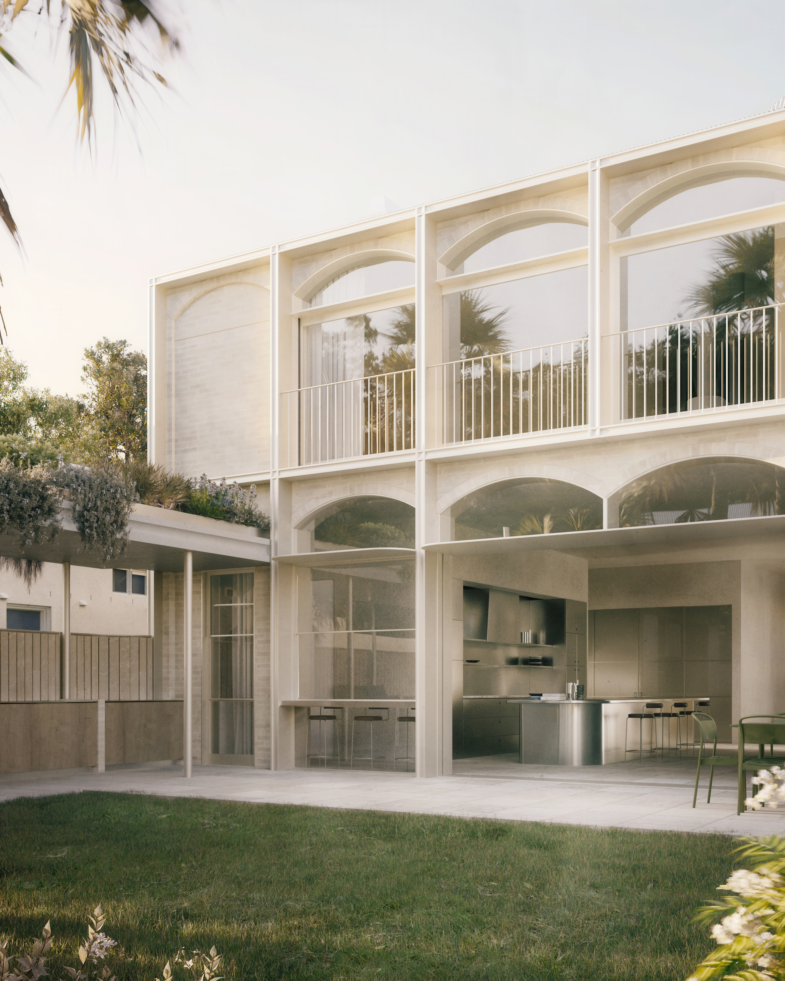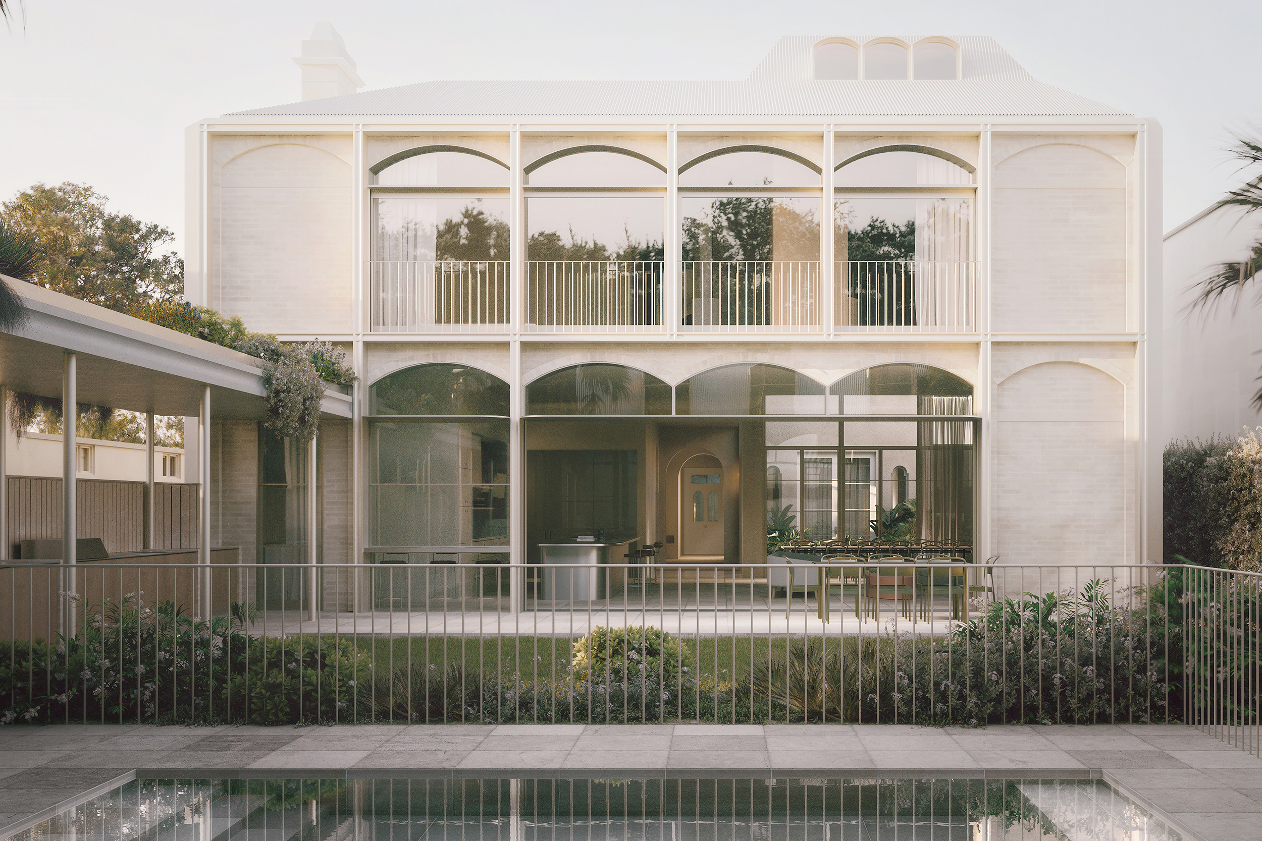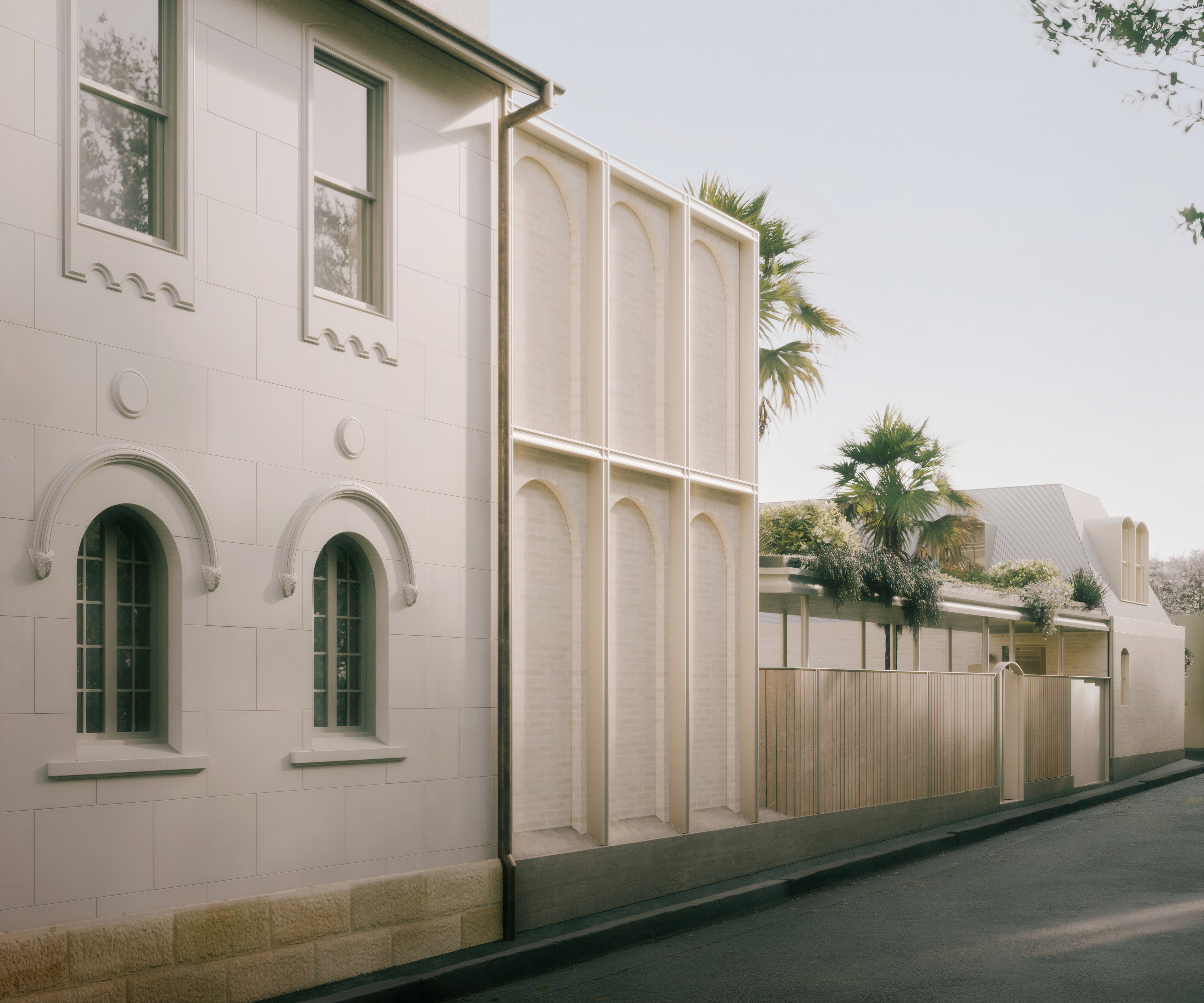 Built in 1885, the original house is peppered with whimsical, decorative features like port-hole windows, stained glass and pressed-paper wainscotting. To tie the old and new together, we’ve continued that sense of playfulness and ornament throughout the new design with features like vaulted cross inlays at the external column junctions, the decorative curved bands in the slab edges and in the brick relief arches on the laneway that reference the preserved heritage windows.